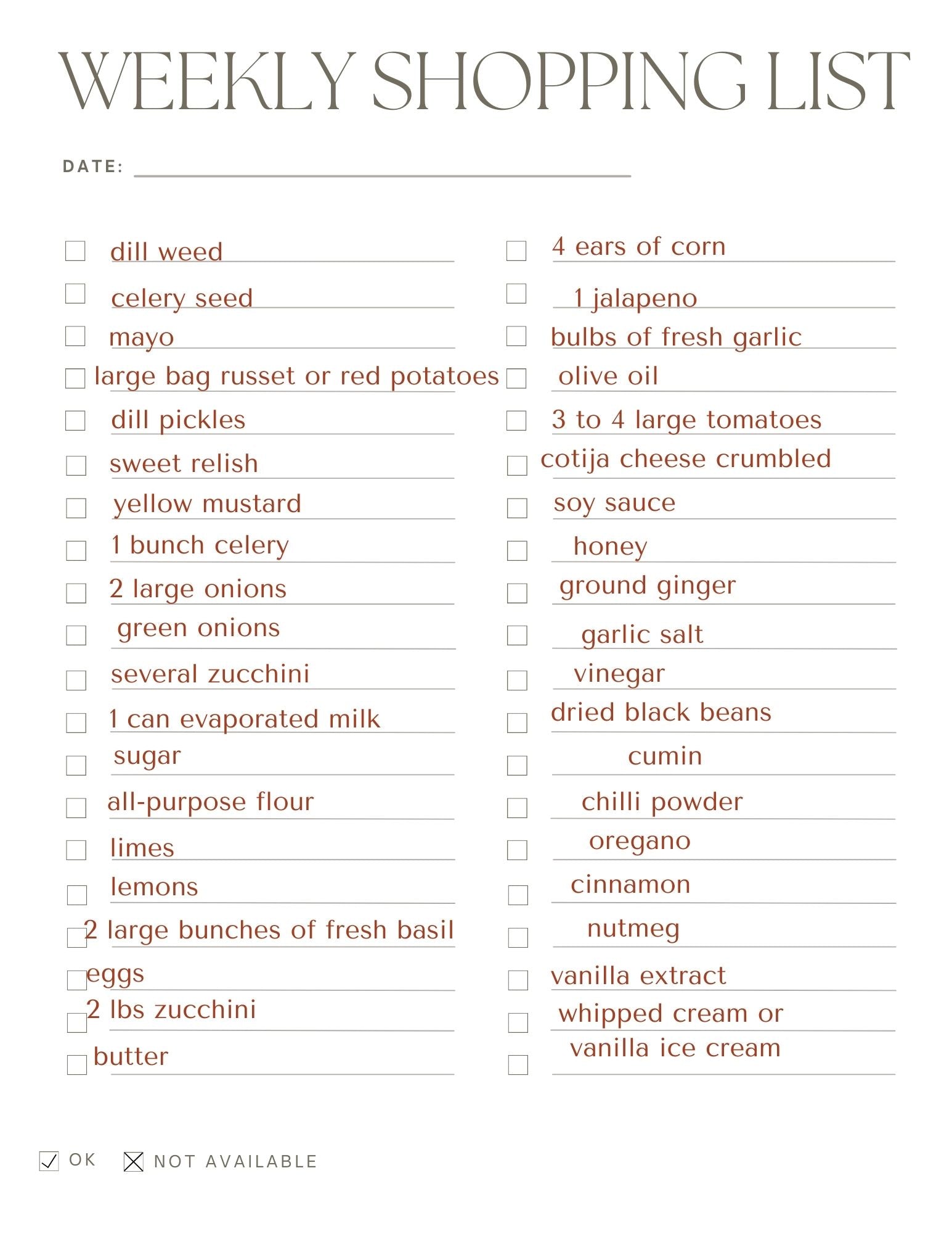 To make things a bit more flexible in the summer kitchen; here is a little guide for the week. You will receive 8 recipes. You only need to cook 3 dinners in a week. Reconstruct left-overs to fill in the rest. You will also receive a weekly calendar, a filled out grocery list and a few empty pages to fill out more recipes and grocery lists. This should make the spontaneity of summer meals, a bit easier. Love ya lots!